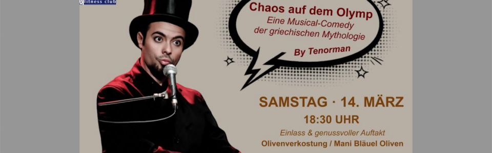 Vorverkauf 23 Euro unter folgendem Link erhältlich https://www.eventbrite.com/e/chaos-auf-dem-olymp-tickets-1982494830405?aff=oddtdtcreator Diese urkomische, interaktive Musical-Comedy bringt griechische Mythen für die ganze Familie auf die Bühne. Persephone ist in … Continue reading Chaos auf dem Olymp / 14. März, Februar, 2026 -Kürten