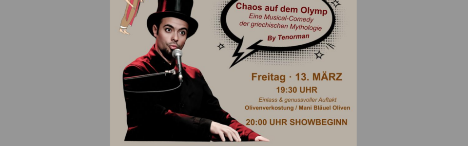 Vorverkauf 13 Euro unter folgendem Link erhältlich https://www.eventbrite.com/e/copy-of-chaos-auf-dem-olymp-tickets-1982623772073?aff=oddtdtcreator Diese urkomische, interaktive Musical-Comedy bringt griechische Mythen für die ganze Familie auf die Bühne. Persephone ist in … Continue reading Chaos auf dem Olymp / 13. März, Februar, 2026 -Bergisch Gladbach